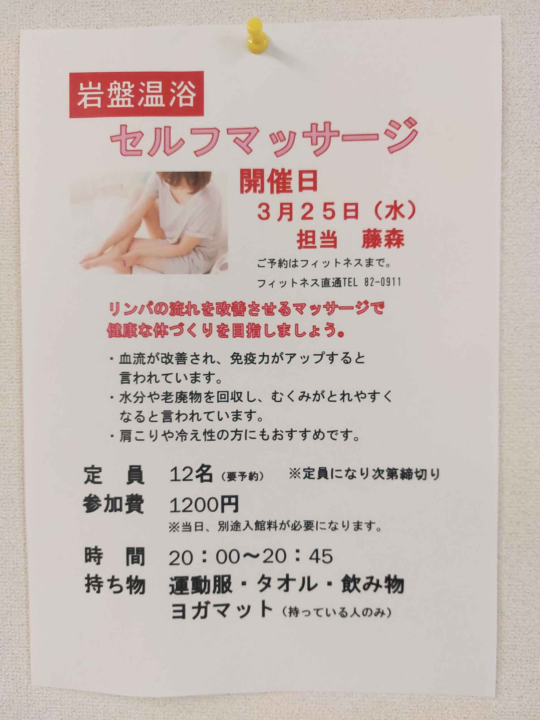 岩盤温浴内にて「岩盤浴セルフマッサージ」を開催します。